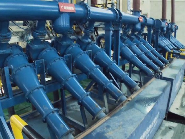 中大型选矿厂通常采用旋流器组来进行矿浆粒度分级,旋流器组中每台旋流器是圆柱形上部,圆锥体下部所组成的衬胶金属筒体。给矿矿浆沿圆柱切线方向流入,在重力及离心力的作用下矿浆进行粒度分级。较粗颗粒的矿浆从锥体下部的沉砂口排出。而较细颗粒的矿浆从圆柱中心的溢流口排出。